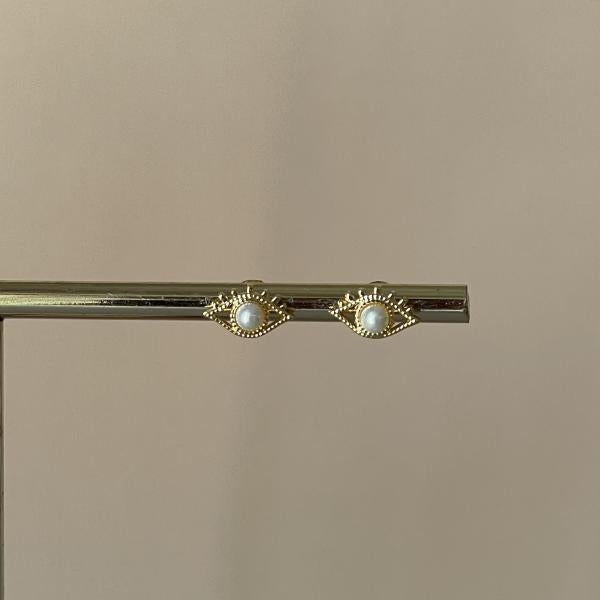 Aretes mini con diseño de ojito con perla en bronce con baño de oro de 18k.